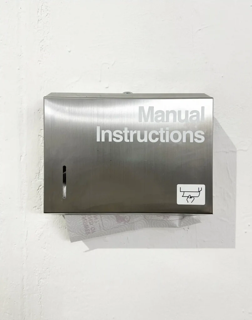 In Gilar’s habit of constantly offering us exhibition “mementos”, the metal tissue dispenser installation mocked corporate training, self-help culture, and the infantilization of young adults in the workforce.