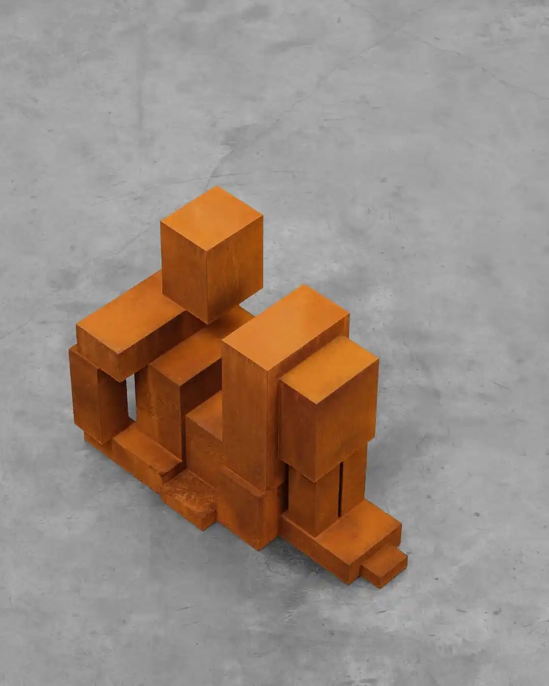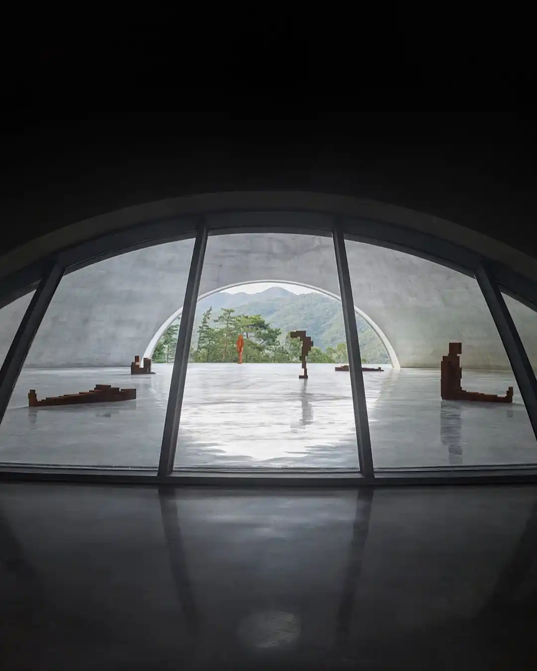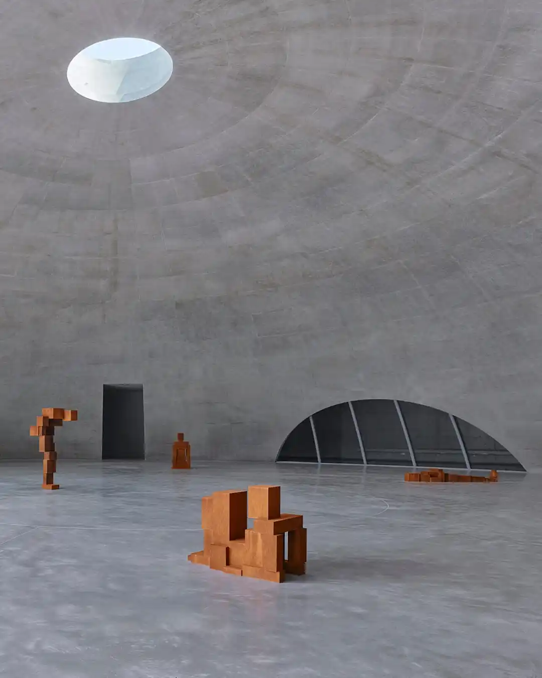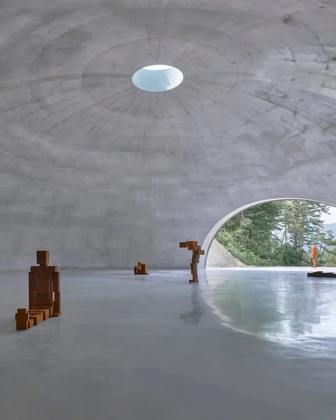 The new 25-metre-wide dome is part of Museum SAN’s expansion, designed as a concrete, cave-like gallery that opens toward the mountains of Wonju. Inside, seven of Gormley’s cast-iron ‘Blockworks’ figures are arranged to interact with natural light from a central oculus and an arched opening, extending the installation to an outdoor terrace.