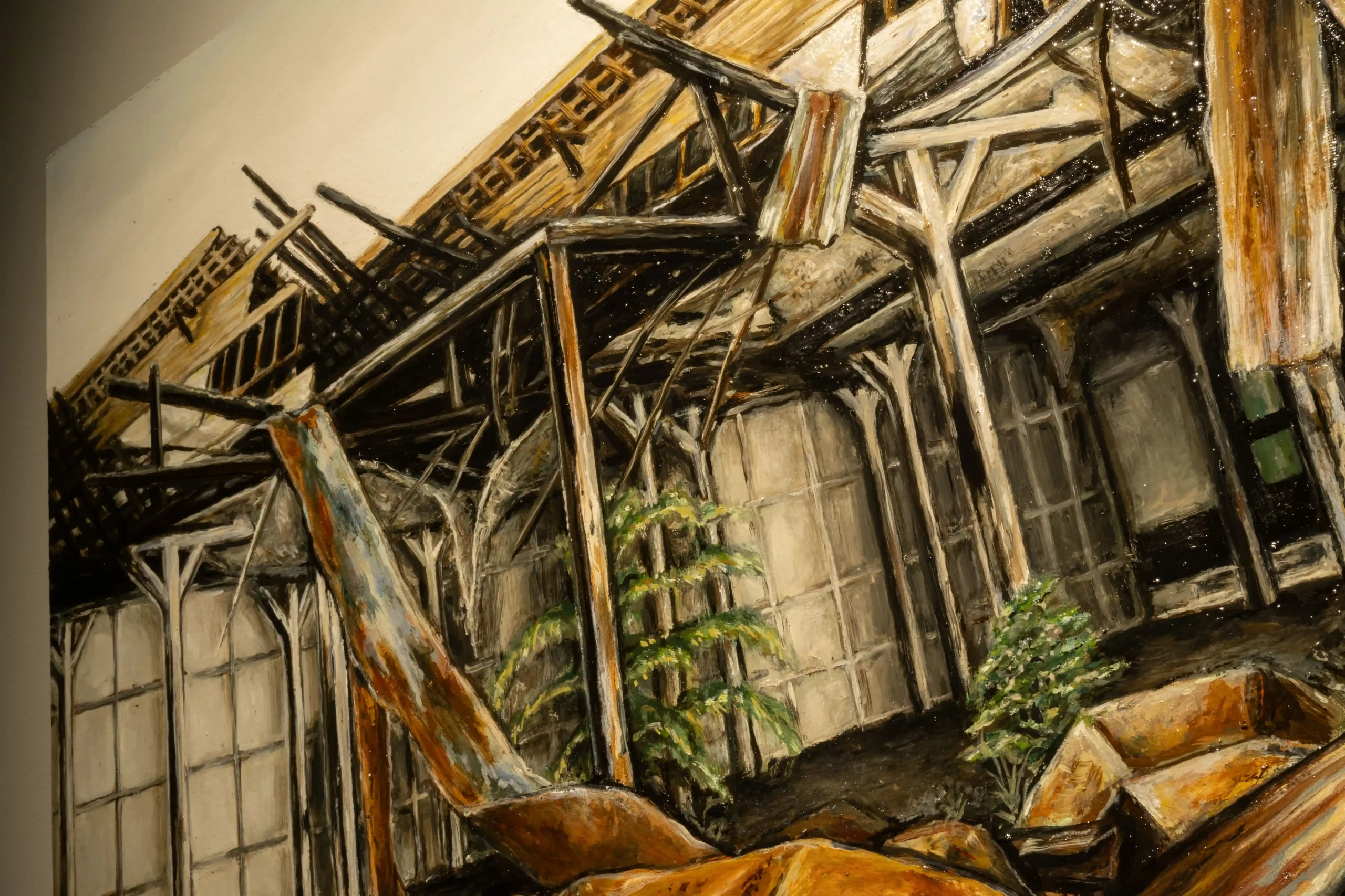 If emptiness (suwung) is Methodos’s point of departure, time is the condition through which that emptiness becomes perceptible. I found myself thinking about how time shapes our understanding of a space, how it gives meaning to what is left behind. So rather than establishing a singular thesis on the meaning of these homes, Methodos allows each work to operate within its own speculative logic, and in Tiga Periode dalam Satu Kanvas (Three Eras on One Canvas, 2024), I found myself pausing longer than expected.