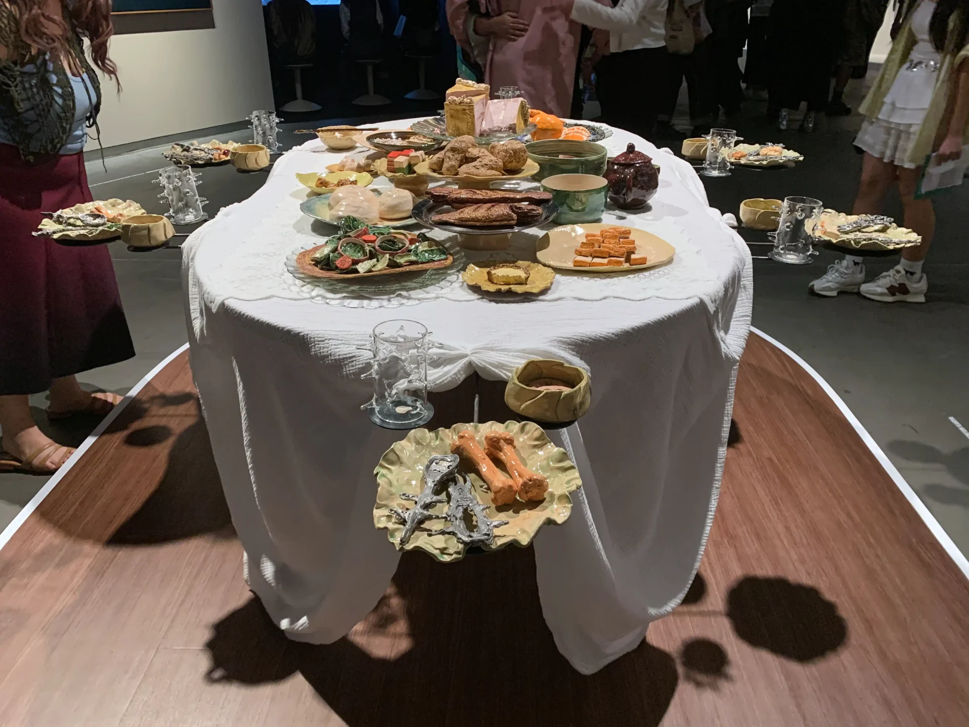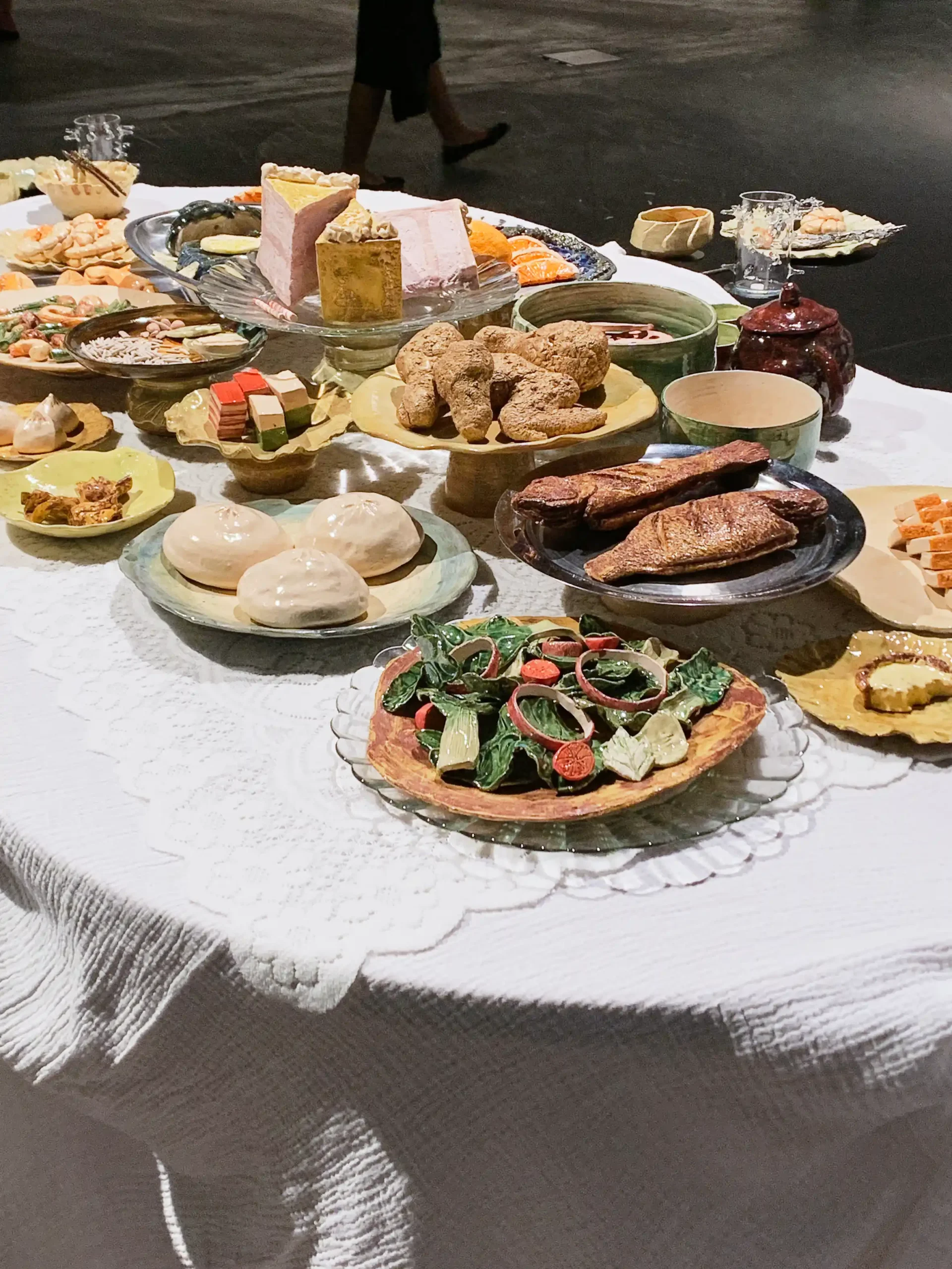 Entering the exhibition space, a grand table full of Chinese and Malay dishes warmly welcomes us into ILHAM Art Show 2025—but this isn’t a dinner for the guests. Upon getting closer, it’s clear that the mouth-watering foods are entirely made of ceramic. It is Kimberley Boudville’s “and here we sit, in the weight of silence”, an installation set to transform the act of dining into a meditation on love and loss of her family members.